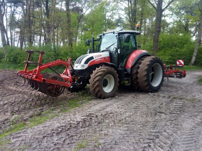 Foto van een Steyr Multi 4095. Eerste perceel zaai klaar liggen voor de maïs. Dit jaar voor het eerst met deze zelf gefabriceerde combi van front pakker met tanden en triltand cultivator.